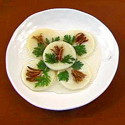 1. Âý½Ò°¡·ç¸¦ ¶ß°Å¿î ¹°·Î À͹ÝÁ×ÇÏ¿© Ä¡´í´Ù. 2. ¾¦°«Àº ª°Ô ÀÙÀ» ¶¼°í, ´ëÃß´Â ¾¾¸¦ ¹ß¶ó ä½ã´Ù. 3. ¹ÝÁ×À¸·Î Áö¸§ 5cm,µÎ²²0.4cmÁ¤µµÀÇ µ¿±Û³³ÀÛÇÑ ÈÀüÀ» ºú¾î ´ëÃß¿Í ¾¦°«À» ºÙ¿© ¸ð¾çÀ» ³»¾î ÁöÁø´Ù. 4. ÈÀü À§¿¡ ´ÞÄÞÇÑ ½Ã·´À» »Ñ¸°´Ù. |